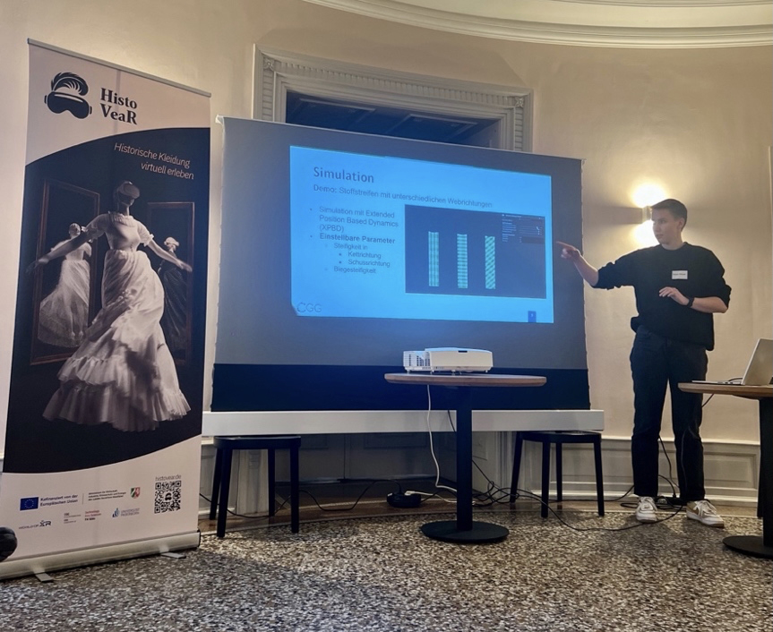 Abschließend stellte Merle Meyer die Fortschritte der Computer Graphics Group (CGG) bei der digitalen Simulation physikalischer Stoffeigenschaften sowie der Kollisionserkennung zwischen Kleidung und Avatar vor.