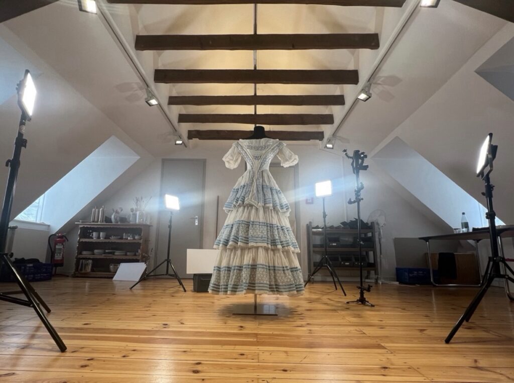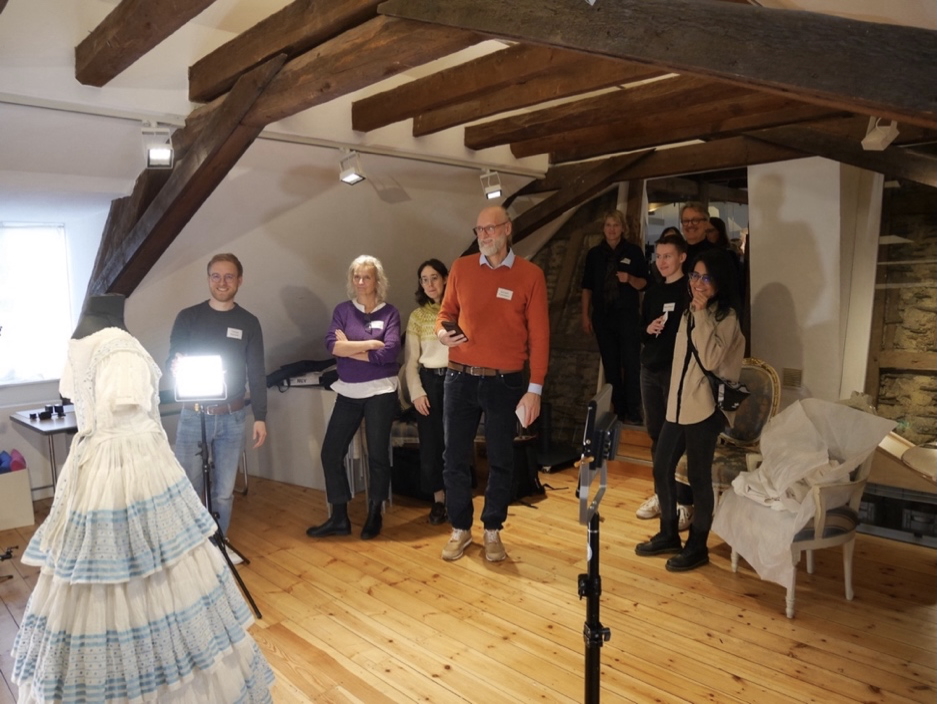 Im Dachgeschoss des Herrenhauses fanden parallel erste Testaufnahmen von historischen Kleidern statt. In Zusammenarbeit mit der Textilrestauratorin Claudia Grohmann prüfte Katja Tümmers Ludwig von World of VR mithilfe mehrerer Testaufnahmen die Raum- und Lichtverhältnisse sowie die idealen Bedingungen für den Scan der Kleidungsstücke. Mit diesen Aufnahmen können im nächsten Schritt bereits weitere Experimente durchgeführt werden. Prof. Dr. Kerstin Kraft und Valentina Rödelberger von der Universität Paderborn verglichen die textile Materialität des Kleides mit historischen Stoffproben. Anhand dieser Stoffproben können im weiteren Projektverlauf die Materialeigenschaften analysiert und für die Simulation verwendet werden, ohne das erhaltene Kleid zu beschädigen.